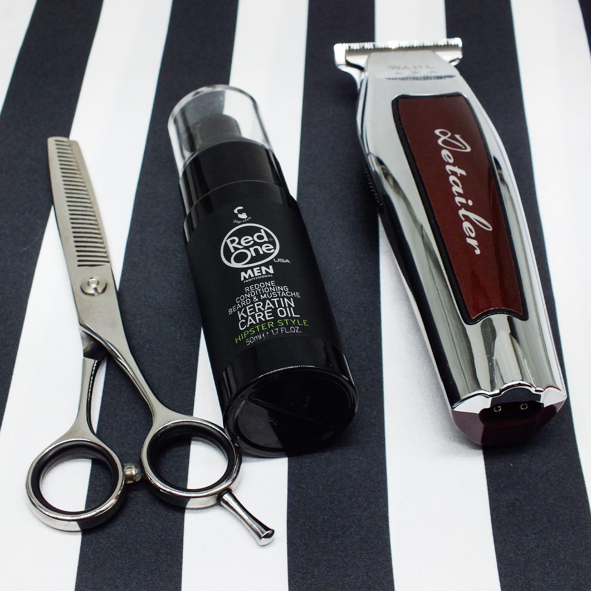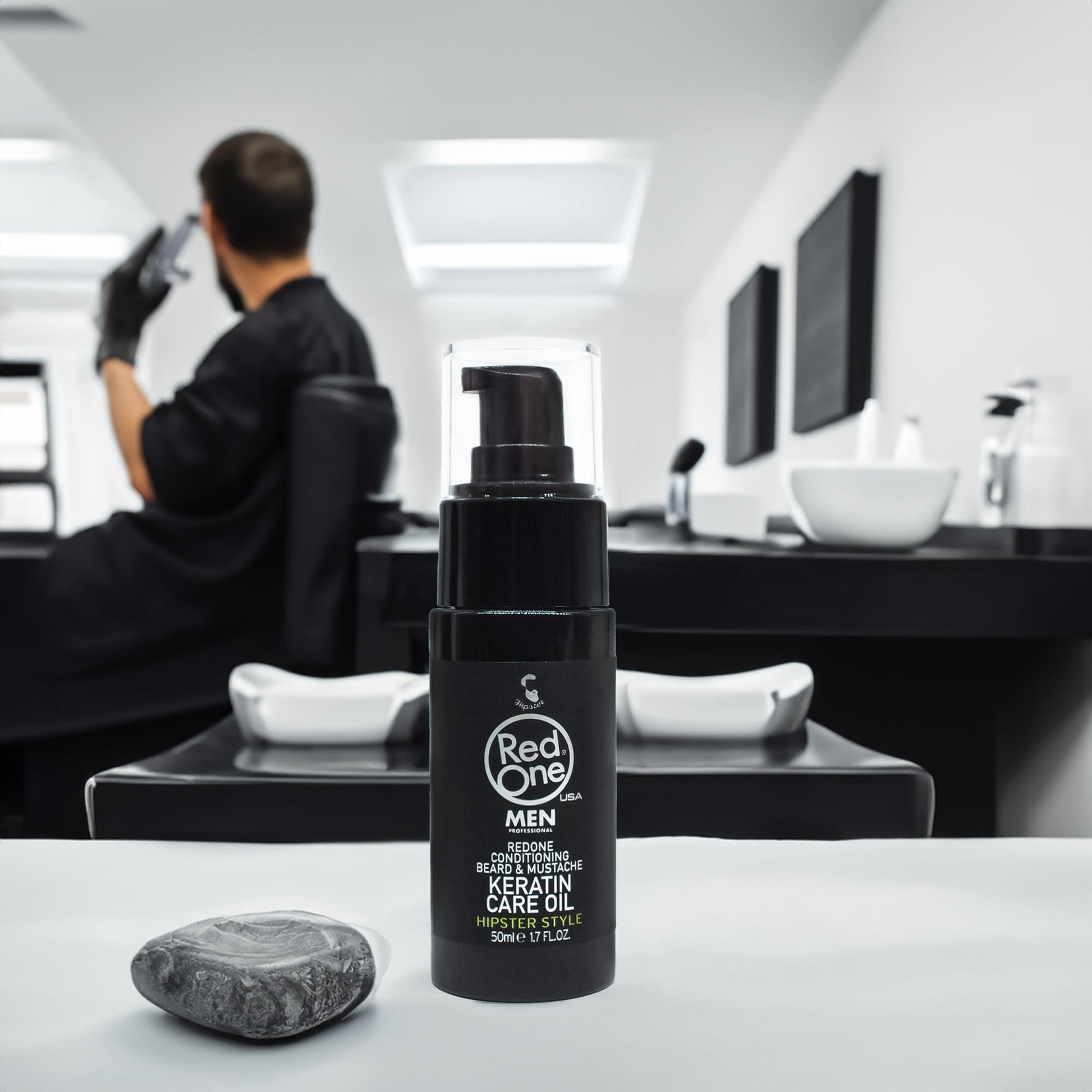 The RedOne Beard & Mustache Keratin Care Oil is a conditioning treatment oil used by professional barbers for softening, nourishing, and maintaining clients' facial hair.