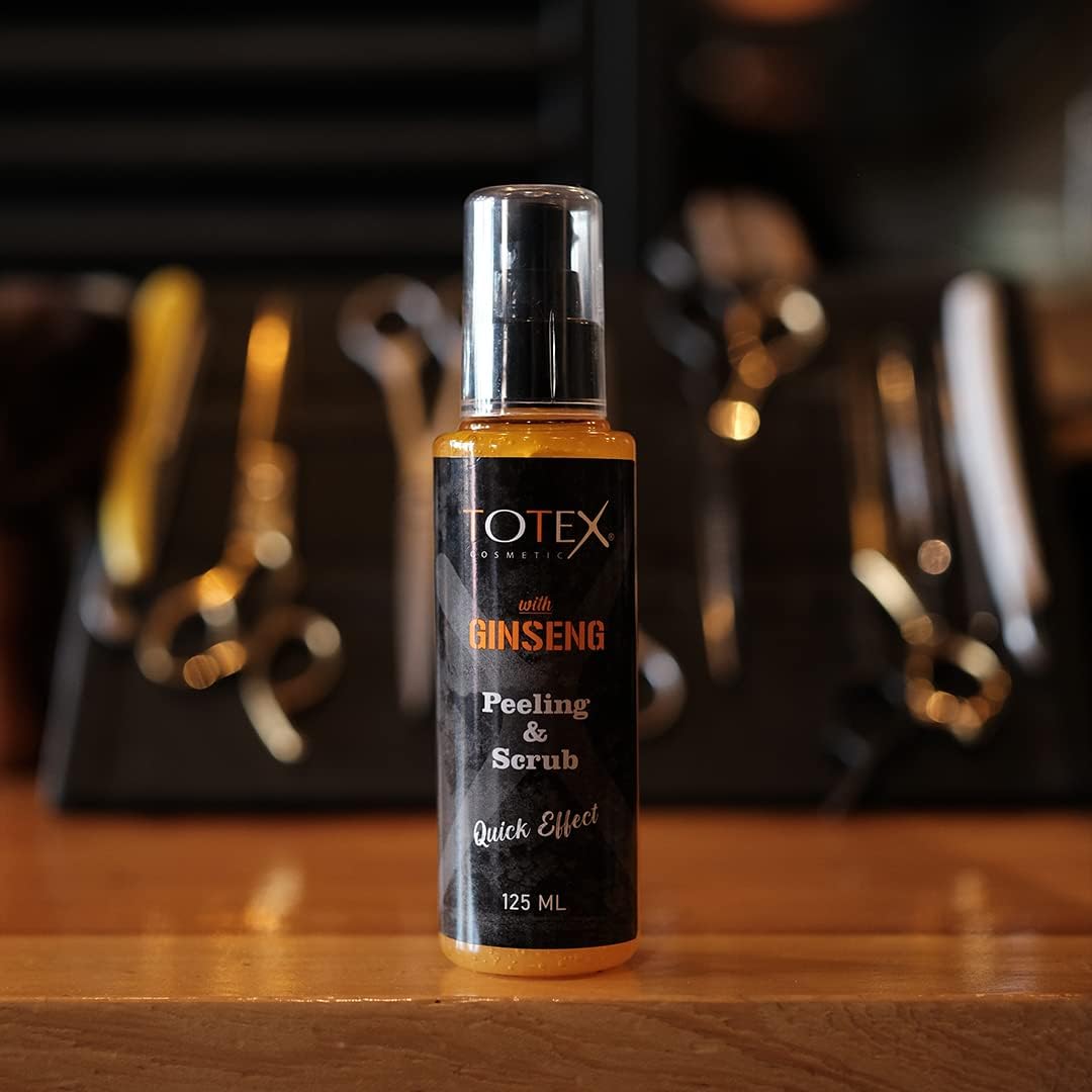 The Totex Face Peeling & Scrub Gel 125ml is a professional exfoliating facial scrub used by barbers to prepare clients' skin before shaving and grooming services.